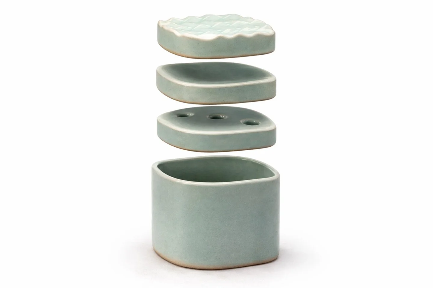 Each piece in the bathroom set is developed with a modular approach, allowing smaller components such as the soap dish and toothbrush holder to nest neatly within the larger container. This system reduces the overall volume of the product, supporting more efficient packaging and overseas shipping.