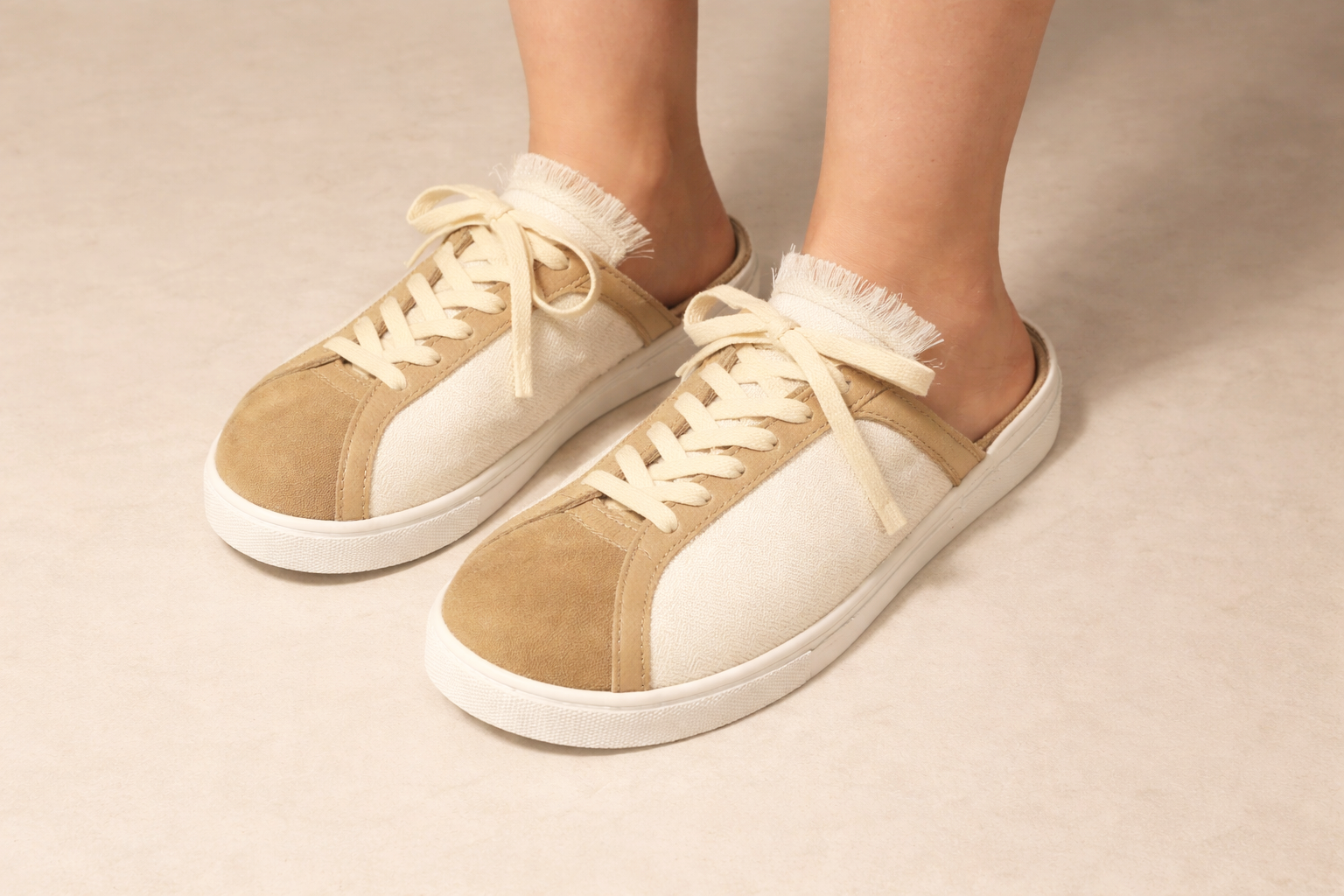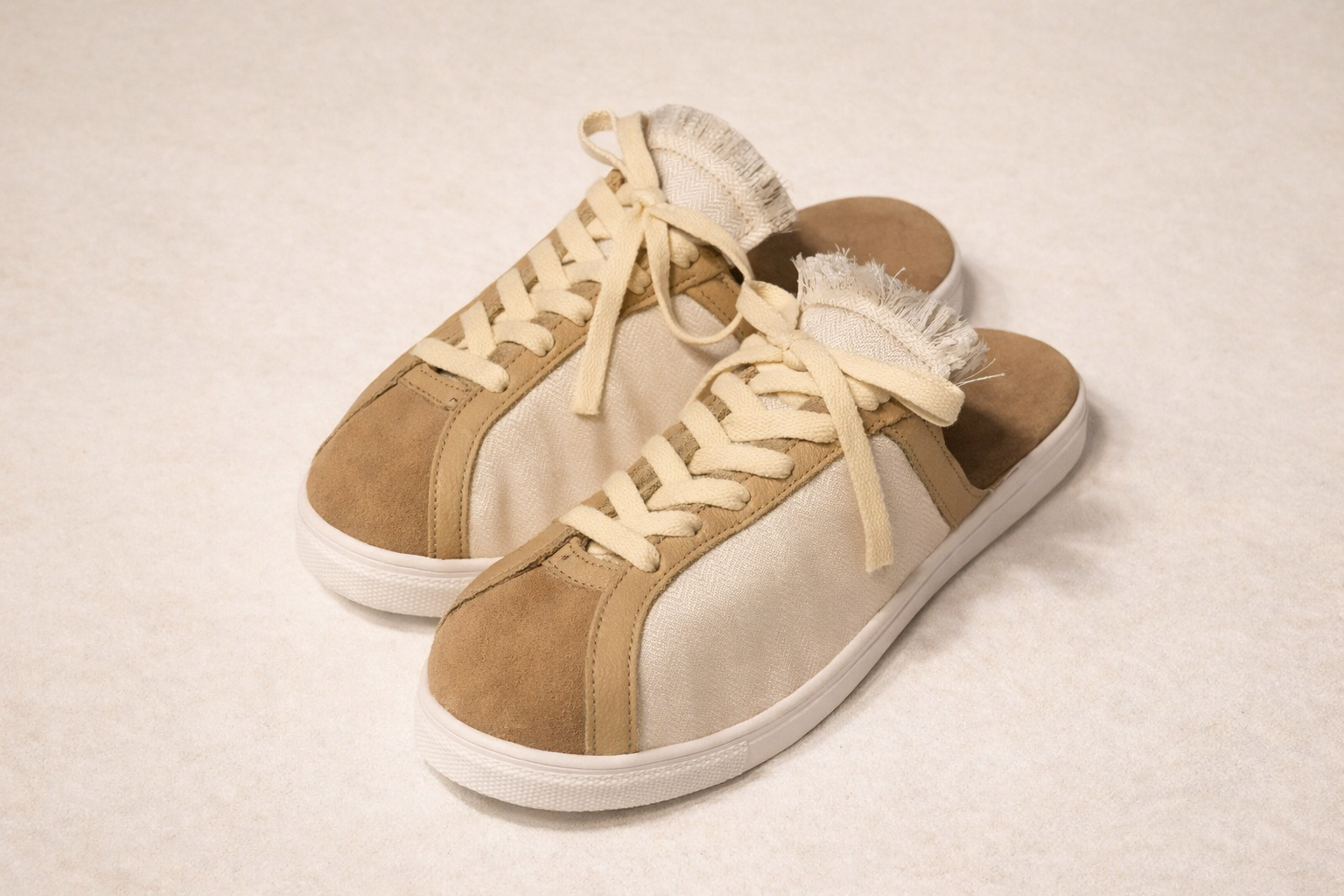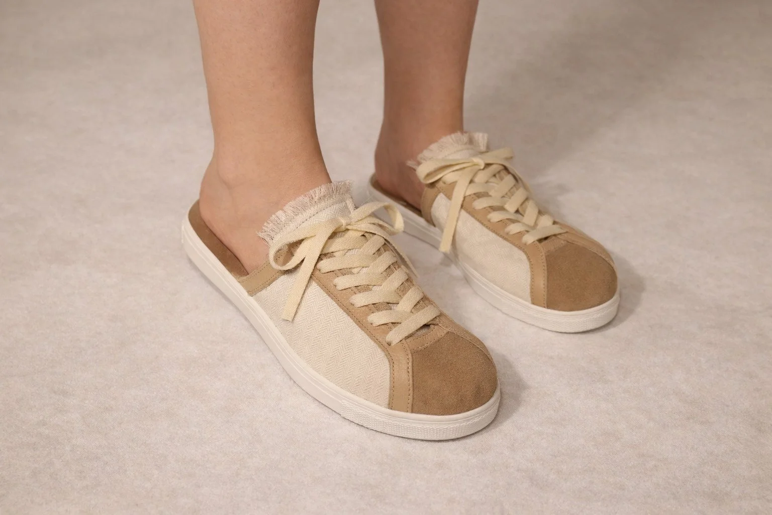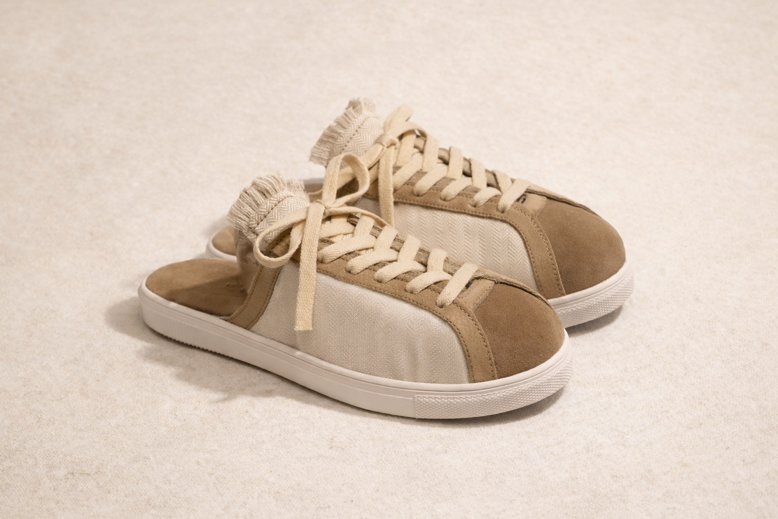 Light mule sneakers for casual outfits. This design was inspired by the movement of rice plants in a large field. The neutral tones are from fully ripe rice plants in a large field. The neutral tones are from fully rice plants in Fall ready to be harvested. The frayed edge of the tongue re[resents the plants and their movements in the wind. The aim was to deliver the coexistence of the warmth and coolness of the weather with form, colors, and materials.
